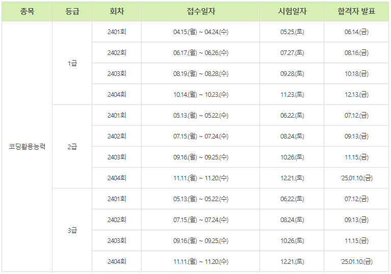 총 3급으로 나누어져잇는 코딩활용능력 자격증 시험일정이다.