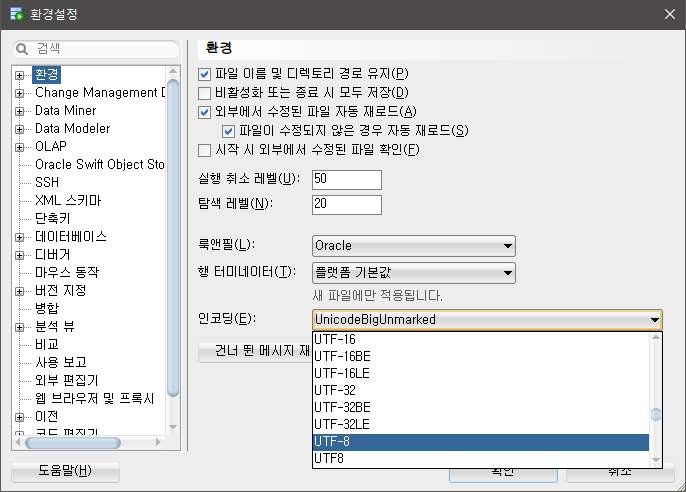 상단 메뉴 도구 > 환경설정 > 환경 >인코딩 > UTF-8 선택 > 확인