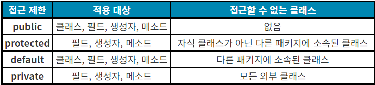 - default 접근 제한: default 접근 제한은 같은 패키지에서는 아무런 제한 없이 생성자를 호출할 수 있으나, 다른 패키지에서는 생성자를 호출할 수 없도록 합니다.