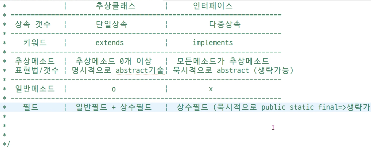 추상클래스 단일상속 클래스명 extends 클래스 로 표기