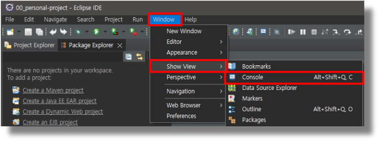 Servlet 세팅 - Eclipse Package Console 창 여는 방법